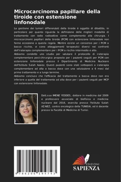 La gestione dei tumori differenziati della tiroide è oggetto di dibattito, in particolare per quanto riguarda la definizione delle migliori modalità di trattamento con iodio radioattivo come complemento alla chirurgia. I microcarcinomi papillari della tiroide (PCM) con estensione linfonodale non fanno eccezione a questa regola. Mentre esiste un consenso per i PCM a basso rischio, vi sono atteggiamenti terapeutici diversi nei confronti dell'iraterapia complementare per i PCM a rischio intermedio e alto.Abbiamo condotto uno studio per valutare il protocollo di iraterapia complementare post-chirurgica proposto per i pazienti seguiti per PCM con estensione linfonodale presso il Dipartimento di Medicina Nucleare dell'Istituto Salah Azaiez. Questi pazienti sono stati sottoposti a iraterapia complementare ad alta o bassa dose con una valutazione a 6 mesi dal primo trattamento e a lungo termine. Abbiamo concluso che l'efficacia del trattamento a bassa dose non era inferiore a quella del trattamento ad alta dose per i pazienti seguiti per MCP con estensione linfonodale.