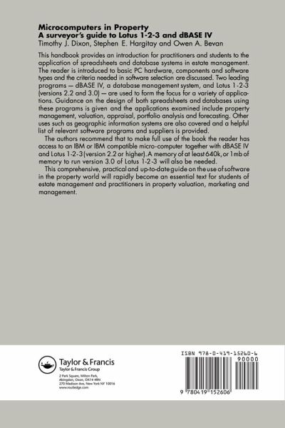 This handbook introduces surveyors to the use of microcomputers in the property industry using 'real-life' example applications with clear explanations, it will provide the surveyor with the knowledge and expertise to design spreadsheets and database management systems for use in a variety of general practice tasks from valuation to estate agency.