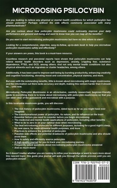 Are you looking to relieve any physical or mental health conditions for which psilocybin has shown potential? Perhaps without the side effects commonly associated with many pharmaceuticals? Are you curious about how microdosing psilocybin mushrooms could noticeably improve your daily performance and general well-being? Looking for a comprehensive, objective, easy-to-follow, up-to-date book to help you microdose psilocybin mushrooms safely and effectively? Countless research and anecdotal reports have shown that psilocybin mushrooms can help relieve mental health disorders such as depression, anxiety, crippling fear, substance dependence, PTSD, and OCD, among others. Also physical ailments such as migraines or cluster headaches, among others. Additionally, it can improve your well-being by bursting productivity, enhancing creativity and cognitive functioning, elevating mood and concentration, physical stamina, and more. Microdosing psilocybin involves the self-administration of one-tenth, one-twentieth, or even as little as one-fiftieth of a normal dose. You experience the substance's benefits without it interfering with your regular functioning and daily life. But even with the outstanding benefits, little is known about microdosing with magic mushrooms, and the information out there lacks accuracy and depth, making this venture harder than it should be... until now. Microdosing Psilocybin Mushrooms is an all-inclusive, carefully researched, beginner-friendly guide to everything there is to know about microdosing with psilocybin mushrooms so that you can steer clear of the guesswork and microdose with a purpose. In this invaluable mushroom guide, you will discover: · The rich history of psilocybin mushrooms, dated back as far as you might have ever imagined · The transformational power of psilocybin, its nature, and its influence on the human brain · Essential factors you need to consider before you begin microdosing · The medicinal and mental health applications of psilocybin, including other benefits · What to do to zero in on your optimal dose when microdosing · The best microdosing protocols for different purposes, including for a good night's sleep, for new users, for medical/mental health purposes, and more · Practices to enhance the potential of psilocybin · Possible side effects and potential drawbacks of psilocybin mushrooms and who should avoid them · How to safely and efficiently source psilocybin · A high-quality journal for you to track your microdosing journey. · Frequently asked questions about microdosing psilocybin mushrooms answered · And so much more! So it doesn't matter whether you've tried microdosing mushrooms before and are looking to refine your knowledge or haven't ever held them in your hand and want to learn more about this nascent topic; this guide plus journal will walk you through the whole process until you are psilocybin-versed! If you are ready to make this happen, get your copy today!