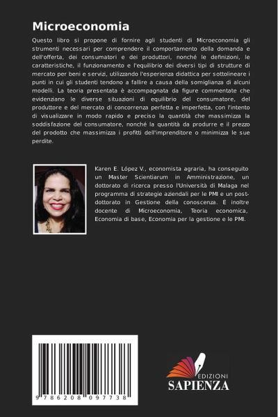 Questo libro si propone di fornire agli studenti di Microeconomia gli strumenti necessari per comprendere il comportamento della domanda e dell'offerta, dei consumatori e dei produttori, nonché le definizioni, le caratteristiche, il funzionamento e l'equilibrio dei diversi tipi di strutture di mercato per beni e servizi, utilizzando l'esperienza didattica per sottolineare i punti in cui gli studenti tendono a fallire a causa della somiglianza di alcuni modelli. La teoria presentata è accompagnata da figure commentate che evidenziano le diverse situazioni di equilibrio del consumatore, del produttore e del mercato di concorrenza perfetta e imperfetta, con l'intento di visualizzare in modo rapido e preciso la quantità che massimizza la soddisfazione del consumatore, nonché la quantità da produrre e il prezzo del prodotto che massimizza i profitti dell'imprenditore o minimizza le sue perdite.