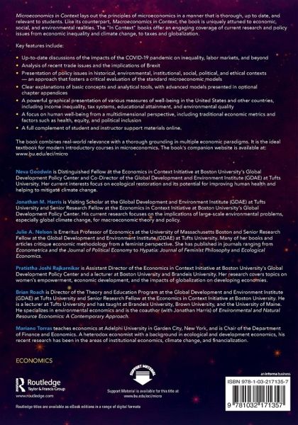 Neva Goodwin is Distinguished Fellow at the Economics in Context Initiative at Boston University's Global Development Policy Center and Co-Director of the Global Development and Environment Institute (GDAE) at Tufts University. Her current interests focus on ecological restoration and its potential for improving human health and helping to mitigate climate change. Jonathan M. Harris is Visiting Scholar at the Global Development and Environment Institute (GDAE) at Tufts University and Senior Research Fellow at the Economics in Context Initiative at Boston University's Global Development Policy Center. His current research focuses on the implications of large-scale environmental problems, especially global climate change, for macroeconomic theory and policy. Julie A. Nelson is Emeritus Professor of Economics at the University of Massachusetts Boston and Senior Research Fellow at the Global Development and Environment Institute (GDAE) at Tufts University. Many of her books and articles critique economic methodology from a feminist perspective. She has published in journals ranging from Econometrica and the Journal of Political Economy to Hypatia: Journal of Feminist Philosophy and Ecological Economics. Pratistha Joshi Rajkarnikar is Assistant Director of the Economics in Context Initiative at Boston University's Global Development Policy Center and a lecturer at Boston University and Brandeis University. Her research covers topics on women's empowerment, economic development, and the impacts of globalization on developing economies. Brian Roach is Director of the Theory and Education Program at the Global Development and Environment Institute (GDAE) at Tufts University and Senior Research Fellow at the Economics in Context Initiative at Boston University. He is a lecturer at Tufts University and has taught at Brandeis University, Brown University, and the University of Maine. He specializes in environmental economics and is the coauthor (with Jonathan Harris) of Environmental and Natural Resource Economics: A Contemporary Approach. Mariano Torras teaches economics at Adelphi University in Garden City, New York, and is Chair of the Department of Finance and Economics. A heterodox economist with a background in ecological and development economics, his recent research has been in the areas of institutional economics, climate change, and financialization.