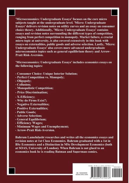 This book contains essays and revision notes for Microeconomics at the undergraduate level. This book includes the following topics: - Utility Curves; - Perfect Competition vs. Monopoly; - Oligopoly; - Collusion; - Monopolistic Competition; - Price Discrimination; - X-Efficiency; - Why do Firms Exist?; - Negative Externalities; - Positive Externalities; - Public Goods; - Adverse Selection; - General Equilibrium; - Efficiency Wages; - Minimum Wages and Unemployment; - Arrow-Pratt Risk-Aversion.