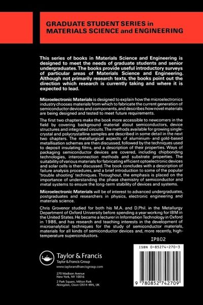 This practical book shows how an understanding of structure, thermodynamics, and electrical properties can explain some of the choices of materials used in microelectronics, and can assist in the design of new materials for specific applications. It emphasizes the importance of the phase chemistry of semiconductor and metal systems for ensuring the long-term stability of new devices. The book discusses single-crystal and polycrystalline silicon, aluminium- and gold-based metallisation schemes, packaging semiconductor devices, failure analysis, and the suitability of various materials for optoelectronic devices and solar cells. It has been designed for senior undergraduates, graduates, and researchers in physics, electronic engineering, and materials science.