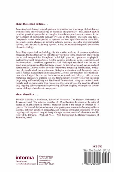 Presenting breakthrough research pertinent to scientists in a wide range of disciplines-from medicine and biotechnology to cosmetics and pharmacy-this Second Edition provides practical approaches to complex formulation problems encountered in the development of particulate delivery systems at the micro- and nano-size level. Completely revised and expanded to represent the most up-to-date studies in the field, this guide covers advances in pulsatile delivery systems, injectable microparticulate systems, and site-specific delivery systems, as well as potential therapeutic applications of nanotechnology.