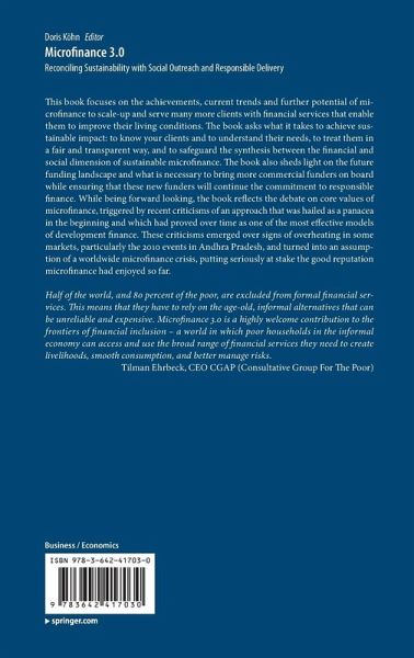 This book focuses on the achievements, current trends and further potential of microfinance to scale-up and serve many more clients with financial services that enable them to improve their living conditions. The book asks what it takes to achieve sustainable impact: to know your clients and to understand their needs, to treat them in a fair and transparent way, and to safeguard the synthesis between the financial and social dimension of sustainable microfinance. The book also sheds light on the future funding landscape and what is necessary to bring more commercial funders on board while ensuring that these new funders will continue the commitment to responsible finance. While being forward looking, the book reflects the debate on core values of microfinance, triggered by recent criticisms of an approach that was hailed as a panacea in the beginning and which had proved over time as one of the most effective models of development finance. These criticisms emerged over signs of overheating in some markets, particularly the 2010 events in Andhra Pradesh, and turned into an assumption of a worldwide microfinance crisis, putting seriously at stake the good reputation microfinance had enjoyed so far.
