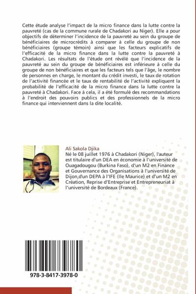 Cette étude analyse l'impact de la micro finance dans la lutte contre la pauvreté (cas de la commune rurale de Chadakori au Niger). Elle a pour objectifs de déterminer l'incidence de la pauvreté au sein du groupe de bénéficiaires de microcrédits à comparer à celle du groupe de non bénéficiaires (groupe témoin) ainsi que les facteurs explicatifs de l'efficacité de la micro finance dans la lutte contre la pauvreté à Chadakori. Les résultats de l'étude ont révélé que l'incidence de la pauvreté au sein du groupe de bénéficiaires est inférieure à celle du groupe de non bénéficiaires et que les facteurs tels que l'âge, le nombre de personnes en charge, le montant du crédit investi, le taux de rotation de l'activité financée et le taux de rentabilité de l'activité expliquent la probabilité de l'efficacité de la micro finance dans la lutte contre la pauvreté à Chadakori. Face à cela, il a été formulé des recommandations à l'endroit des pouvoirs publics et des professionnels de la micro finance qui interviennent dans la dite localité.