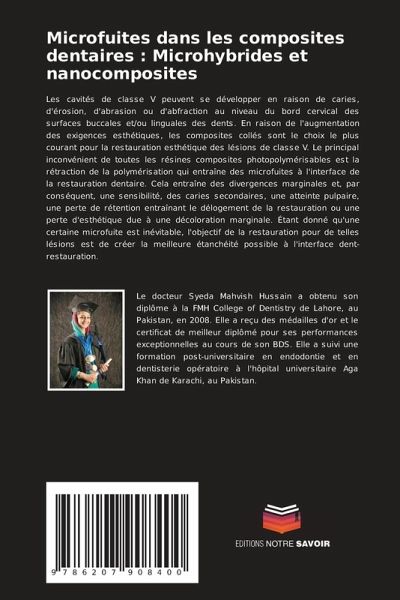 Les cavités de classe V peuvent se développer en raison de caries, d'érosion, d'abrasion ou d'abfraction au niveau du bord cervical des surfaces buccales et/ou linguales des dents. En raison de l'augmentation des exigences esthétiques, les composites collés sont le choix le plus courant pour la restauration esthétique des lésions de classe V. Le principal inconvénient de toutes les résines composites photopolymérisables est la rétraction de la polymérisation qui entraîne des microfuites à l'interface de la restauration dentaire. Cela entraîne des divergences marginales et, par conséquent, une sensibilité, des caries secondaires, une atteinte pulpaire, une perte de rétention entraînant le délogement de la restauration ou une perte d'esthétique due à une décoloration marginale. Étant donné qu'une certaine microfuite est inévitable, l'objectif de la restauration pour de telles lésions est de créer la meilleure étanchéité possible à l'interface dent-restauration.