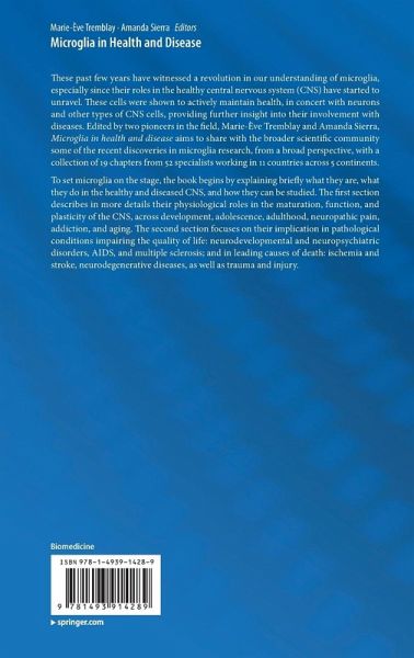 These past few years have witnessed a revolution in our understanding of microglia, especially since their roles in the healthy central nervous system (CNS) have started to unravel. These cells were shown to actively maintain health, in concert with neurons and other types of CNS cells, providing further insight into their involvement with diseases. Edited by two pioneers in the field, Marie-Ève Tremblay and Amanda Sierra, Microglia in health and disease aims to share with the broader scientific community some of the recent discoveries in microglia research, from a broad perspective, with a collection of 19 chapters from 52 specialists working in 11 countries across 5 continents.
