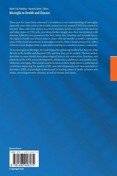 These past few years have witnessed a revolution in our understanding of microglia, especially since their roles in the healthy central nervous system (CNS) have started to unravel. These cells were shown to actively maintain health, in concert with neurons and other types of CNS cells, providing further insight into their involvement with diseases. Edited by two pioneers in the field, Marie-Ève Tremblay and Amanda Sierra, Microglia in health and disease aims to share with the broader scientific community some of the recent discoveries in microglia research, from a broad perspective, with a collection of 19 chapters from 52 specialists working in 11 countries across 5 continents.