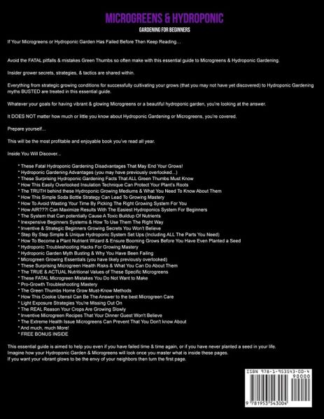 If Your Microgreens or Hydroponic Garden Has Failed Before Then Keep Reading... Avoid the FATAL pitfalls & mistakes Green Thumbs so often make with this essential guide to Microgreens & Hydroponic Gardening. Insider grower secrets, strategies, & tactics are shared within. Everything from strategic growing conditions for successfully cultivating your grows (that you may not have yet discovered) to Hydroponic Gardening myths BUSTED are treated in this essential guide. Whatever your goals for having vibrant & glowing Microgreens or a beautiful hydroponic garden, you're looking at the answer. It DOES NOT matter how much or little you know about Hydroponic Gardening or Microgreens, you're covered. Inside You Will Discover...These Fatal Hydroponic Gardening Disadvantages That May End Your Grows! Hydroponic Gardening Advantages (you may have previously overlooked...) These Surprising Hydroponic Gardening Facts That ALL Green Thumbs Must Know How This Easily Overlooked Insulation Technique Can Protect Your Plant's Roots The TRUTH behind these Hydroponic Growing Mediums & What You Need To Know About Them How This Simple Soda Bottle Strategy Can Lead To Growing Mastery How To Avoid Wasting Your Time By Picking The Right Growing System For You How AIR???! Can Maximize Results With The Easiest Hydroponics System For Beginners The System that Can potentially Cause A Toxic Buildup Of Nutrients Inexpensive Beginners Systems & How To Use Them The Right Way Inventive & Strategic Beginners Growing Secrets You Won't Believe Step By Step Simple & Unique Hydroponic System Set Ups (Including ALL The Parts You Need) How To Become a Plant Nutrient Wizard & Ensure Booming Grows Before You Have Even Planted a Seed Hydroponic Troubleshooting Hacks For Growing Mastery Hydroponic Garden Myth Busting & Why You Have Been Failing Microgreen Growing Essentials (you have likely previously overlooked) These Surprising Microgreen Health Risks & What You Can Do About Them The TRUE & ACTUAL Nutritional Values of These Specific Microgreens These FATAL Microgreen Mistakes You Do Not Want to Make The Green Thumbs Home Grow Must-Know Methods How This Cookie Utensil Can Be The Answer to the best Microgreen Care Light Exposure Strategies You're Missing Out On The REAL Reason Your Crops Are Growing Slowly Inventive Microgreen Recipes That Your Dinner Guest Won't Believe The Extreme Health Issue Microgreens Can Prevent That You Don't know About And much, much More! * FREE BONUS INSIDE* This essential guide is aimed to help you even if you have failed time & time again, or if you have never planted a seed in your life. Imagine how your Hydroponic Garden & Microgreens will look once you master what is inside these pages. If you want your vibrant grows to be the envy of your neighbours then click "add to cart".