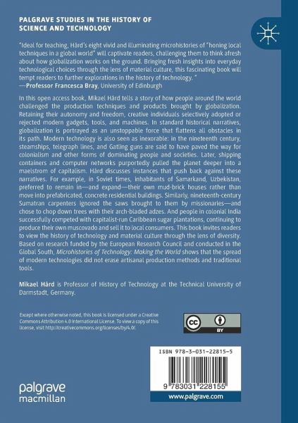 In this open access book, Mikael Hård tells a story of how people around the world challenged the production techniques and products brought by globalization. Retaining their autonomy and freedom, creative individuals selectively adopted or rejected modern gadgets, tools, and machines. In standard historical narratives, globalization is portrayed as an unstoppable force that flattens all obstacles in its path. Modern technology is also seen as inexorable: in the nineteenth century, steamships, telegraph lines, and Gatling guns are said to have paved the way for colonialism and other forms of dominating people and societies. Later, shipping containers and computer networks purportedly pulled the planet deeper into a maelstrom of capitalism. Hård discusses instances that push back against these narratives. For example, in Soviet times, inhabitants of Samarkand, Uzbekistan, preferred to remain in-and expand-their own mud-brick houses rather than move into prefabricated, concreteresidential buildings. Similarly, nineteenth-century Sumatran carpenters ignored the saws brought to them by missionaries-and chose to chop down trees with their arch-bladed adzes. And people in colonial India successfully competed with capitalist-run Caribbean sugar plantations, continuing to produce their own muscovado and sell it to local consumers. This book invites readers to view the history of technology and material culture through the lens of diversity. Based on research funded by the European Research Council and conducted in the Global South, Microhistories of Technology: Making the World shows that the spread of modern technologies did not erase artisanal production methods and traditional tools.