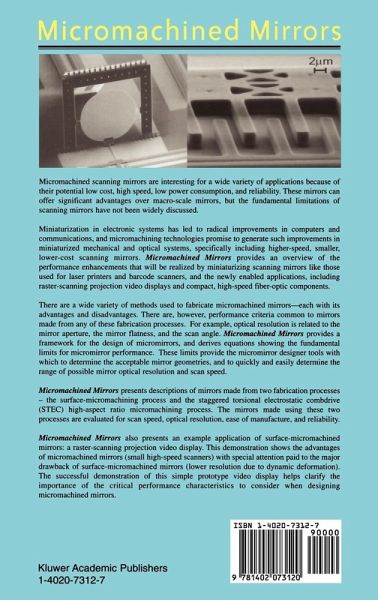 There are a wide variety of methods used to fabricate micromachined mirrors - each with its advantages and disadvantages. There are, however, performance criteria common to mirrors made from any of these fabrication processes. For example, optical resolution is related to the mirror aperture, the mirror flatness, and the scan angle. Micromachined Mirrors provides a framework for the design of micromirrors, and derives equations showing the fundamental limits for micromirror performance. These limits provide the micromirror designer tools with which to determine the acceptable mirror geometries, and to quickly and easily determine the range of possible mirror optical resolution and scan speed.