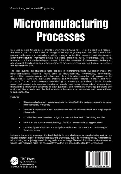 Increased demand for and developments in micromanufacturing have created a need for a resource that covers both the science and technology of this rapidly growing area. With contributions from eminent professors and researchers actively engaged in teaching, research, and development, Micromanufacturing Processes details the basic principles, tools, techniques, and latest advances in micromanufacturing processes. It includes coverage of measurement techniques and research trends as well as a large number of cross-references, making it useful to the students and researchers alike. The book outlines the challenges faced not only in micromanufacturing but also in meso- and nanomanufacturing, exploring topics such as micromachining, micro welding, microforming, micromolding, nanofinishing and micro-/nano-metrology. It includes examples that demonstrate the capabilities of fabricating micro- / nano-products and micro- / nano-features on the macro and micro products. The text also discusses nanofinishing techniques giving surface finish in the domain of sub-nano level, micro welding techniques, namely, laser beam micro welding, electron beam micro welding, micro / nano patterning in large quantities, and micro / nano metrology principles and equipments. It goes on to describe devices such as nano spring, micro mixer, micro cantilever, to name just a few. Unique in its level of coverage, the book highlights new challenges in manufacturing and covers several different types of micromanufacturing processes, such as micromachining, microforming, microcasting, microjoining, nanofinishing, and micrometrology. The level of details, extensive references, figures, and diagrams make the book a reference that will become the standard for this field.