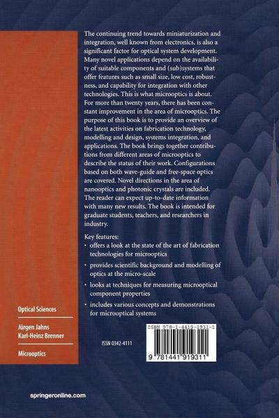 Microoptics is still an emerging field with a huge potential for a large number of applications. This monograph brings together the most recent developments in order to give a broad overview. The continuing trend towards miniaturisation and integration, well-known from electronics, is also a significant factor for optical system development. Many novel applications depend on the availability of suitable components and (sub-)systems that offer features like small size, low cost, robustness, capability for integration with other technologies, etc. This is what micro-optics is about. For more than 20 years, there has been constant improvement in the area of micro-optics. The purpose of this book is to provide an overview of the latest activities on fabrication technology, modelling and design, systems integration and applications. The book brings together contributions from different areas of micro-optics to describe the status of their work. Configurations based on both, wave-guideand free-space optics are covered. The reader can expect up-to-date information with many new results. The book is intended for graduate students, teachers as well as researchers in industry.