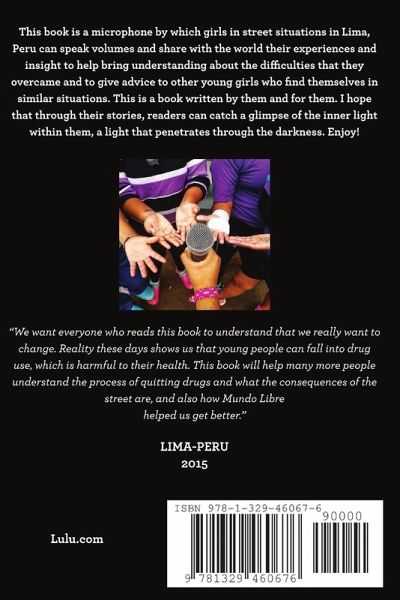 *Black and White Version* This book is a microphone by which girls in street situations in Lima, Peru can speak volumes and share with the world their experiences and insight to help bring understanding about the difficulties that they overcame and to give advice to other young girls who find themselves in similar situations. This is a book written by them and for them. I hope that through their stories, readers can catch a glimpse of the inner light within them, a light that penetrates through the darkness. Enjoy!