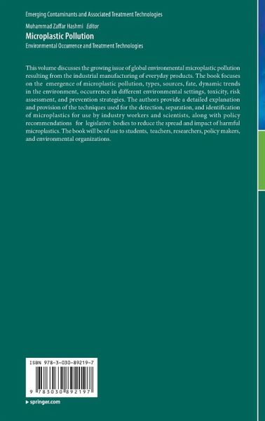 Part1. Introduction to Plastic pollution.- Chapter1. Emerging issue of Microplastic in Sediments and Surface water of South Asia: A Review of Status, Research Needs and Data Gaps.- Chapter2. Extraction, Enumeration and Identification Methods for Monitoring Microplastics in the Aquatic Environment.- Chapter3. Monitoring of Microplastic Pollution.- Chapter4. Polymer types of microplastic in coastal areas.- Chapter5. Evaluation of Different Metrics to Study Microplastics as an Environmental Forensic Tool.- Part2. Environmental Occurrence.- Chapter6. Atmospheric microplastic distribution, fate, and behaviour in context to pollution.- Chapter7. Microplastic Pollution in the Context of Occurrence, Distribution, Composition, and Concentration in Surface Waters and Sediments: A Global Overview.- Chapter8. Microplastic Pollution in the Black Sea: An Overview of the Current Situation.- Chapter9. Occurrence and fate of microplastics in freshwater resources.- Chapter10. Occurrence of microplastic pollution in freshwater.- Chapter11. Occurrence of Microplastic Pollution in Coastal Areas.- Chapter12. Modeling the fate and transport of microplastics in coastal areas.- Chapter13. Occurrence of microplastic pollution in marine water.- Part III. Risk assessment and health impact.- Chapter14. Microplastic Pollution and Contamination of Seafood (including fish, sharks, mussels, oysters, shrimps, and seaweeds): A Global Overview.- Chapter15. Impacts of Plasticizers on Riverine Ecological Integrity in Context to Sustainability Challenges.- Chapter16. Consequences of Plastic Trash on Behavior and Ecology of Birds.- Chapter17. Risk assessment of microplastic pollution.- Chapter18. The ecotoxicological effects of microplastics on trophic levels of aquatic ecosystems.- Chapter19. Ecological and public health effects of microplastics pollution.- PartIV. Treatment Technologies.- Chapter20. Microplastics as an emerged contaminant and its potential treatment technologies.- Chapter21. Green treatment technologies for microplastic pollution.- Chapter22. Chemical Technologies to degrade microplastic pollution.- Chapter23. Bibliometric Analysis of Emerging Trends in Research on Microplastic Pollution in Post-Paris Agreement and Post-COVID-19 Pandemic World.