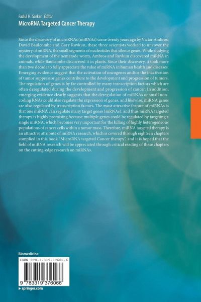 Since the discovery of microRNAs (miRNAs) some twenty years ago by Victor Ambros, David Baulcombe and Gary Ruvkun, these three scientists worked to uncover the mystery of miRNA, the small segments of nucleotides that silence genes. While studying the development of the nematode worm, Ambros and Ruvkun discovered miRNA in animals, while Baulcombe discovered it in plants. Since their discovery, it took more than two decade to fully appreciate the value of miRNA in human health and diseases. Emerging evidence suggest that the activation of oncogenes and/or the inactivation of tumor suppressor genes contribute to the development and progression of tumors. The regulation of genes is by far controlled by many transcription factors which are often deregulated during the development and progression of cancer. In addition, emerging evidence clearly suggests that the deregulation of miRNAs or small non-coding RNAs could also regulate the expression of genes and likewise, miRNA genes are also regulated by transcription factors. The most attractive feature of miRNAs is that one miRNA can regulate many target genes (mRNAs) and thus miRNA targeted therapy is highly promising because multiple genes could be regulated by targeting a single miRNA, which becomes very important for the killing of highly heterogeneous populations of cancer cells within a tumor mass. Therefore, miRNA targeted therapy is an attractive attribute of miRNA research, which is covered through eighteen chapters complied in this book "MicroRNA targeted Cancer therapy" and it is hoped that the field of miRNA research will be appreciated through critical reading of these chapters on the cutting-edge research on miRNAs.
