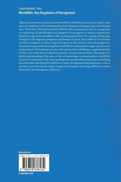 Aberrant expression and function of microRNAs (miRNAs) in cancer have added a new layer of complexity to the understanding of development and progression of the disease state. It has been demonstrated that miRNAs have a crucial function in oncogenesis by regulating cell proliferation and apoptosis as oncogenes or tumor suppressors. The expression signatures of miRNAs provide exciting opportunities in the diagnosis, prognosis and therapy of cancer. Since miRNAs can function as either oncogenes or tumor suppressor genes in oncogenesis, the potential of using these small RNAs as therapeutic…mehr