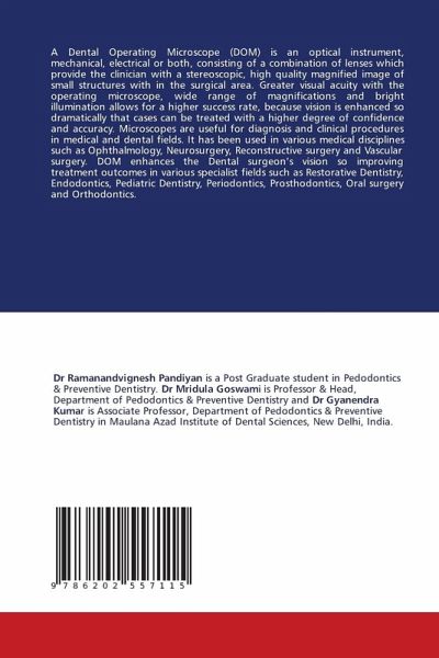 A Dental Operating Microscope (DOM) is an optical instrument, mechanical, electrical or both, consisting of a combination of lenses which provide the clinician with a stereoscopic, high quality magnified image of small structures with in the surgical area. Greater visual acuity with the operating microscope, wide range of magnifications and bright illumination allows for a higher success rate, because vision is enhanced so dramatically that cases can be treated with a higher degree of confidence and accuracy. Microscopes are useful for diagnosis and clinical procedures in medical and dental fields. It has been used in various medical disciplines such as Ophthalmology, Neurosurgery, Reconstructive surgery and Vascular surgery. DOM enhances the Dental surgeon's vision so improving treatment outcomes in various specialist fields such as Restorative Dentistry, Endodontics, Pediatric Dentistry, Periodontics, Prosthodontics, Oral surgery and Orthodontics.