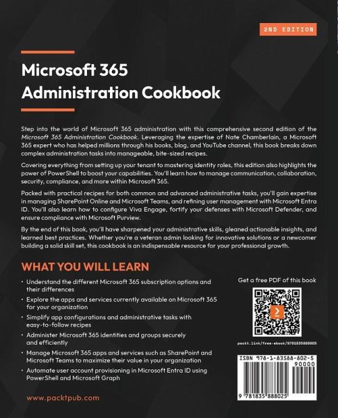 Make the most out of your investment in Microsoft 365 apps and services with this Microsoft 365 cookbook for IT administrators Key Features: - Discover how Microsoft 365 collaboration apps seamlessly integrate with other Microsoft products like Microsoft Entra ID, Purview, Defender, and Power Platform - Use PowerShell to automate tasks and improve your overall efficiency in Microsoft 365 - Uncover best practices for managing Microsoft 365 apps and services - Purchase of the print or Kindle book includes a free PDF eBook Book Description: Step into the world of Microsoft 365 administration with this comprehensive second edition of the Microsoft 365 Administration Cookbook. Leveraging the expertise of Nate Chamberlain, a Microsoft 365 expert who has helped millions through his books, blog, and YouTube channel, this book breaks down complex administration tasks into manageable, bite-sized recipes. Covering everything from setting up your tenant to mastering identity roles, this edition also highlights the power of PowerShell to boost your capabilities. You'll learn how to manage communication, collaboration, security, compliance, and more within Microsoft 365. Packed with practical recipes for both common and advanced administrative tasks, you'll gain expertise in managing SharePoint Online and Microsoft Teams, and refining user management with Microsoft Entra ID. You'll also learn how to configure Viva Engage, fortify your defenses with Microsoft Defender, and ensure compliance with Microsoft Purview. By the end of this book, you'll have sharpened your administrative skills, gleaned actionable insights, and learned best practices. Whether you're a veteran admin looking for innovative solutions or a newcomer building a solid skill set, this cookbook is an indispensable resource for your professional growth. What You Will Learn: - Understand the different Microsoft 365 subscription options and their differences - Explore the apps and services currently available on Microsoft 365 for your organization - Simplify app configurations and administrative tasks with easy-to-follow recipes - Administer Microsoft 365 identities and groups securely and efficiently - Manage Microsoft 365 apps and services such as SharePoint and Microsoft Teams to maximize their value in your organization - Automate user account provisioning in Microsoft Entra ID using PowerShell and Microsoft Graph Who this book is for: This book is for IT professionals tasked with Microsoft 365 administration. Whether you're new to Microsoft 365 administration or just looking for ideas, this cookbook offers step-by-step recipes and detailed guidance to enhance your organization's app and service management and productivity. This new edition will also help you stay up to date with the latest features and capabilities in Microsoft 365. Table of Contents - Microsoft 365 Setup and Basic Administration - Microsoft 365 Identity and Roles - Administering Microsoft 365 with PowerShell - Managing Exchange Online - Setting Up and Configuring Microsoft Search - Administering OneDrive for Business - Configuring Power Platform - Administering SharePoint Online - Managing Microsoft Teams - Managing Viva Engage - Configuring and Managing Users in Microsoft Entra ID - Understanding Microsoft Defender - Understanding the Microsoft Purview Portal - Monitoring Microsoft 365 Apps and Services - Appendix