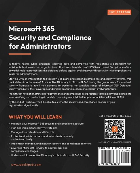 Master the art of configuring and securing Microsoft 365, emphasizing robust security and compliance features, and managing privacy and risk in the Microsoft 365 environmentKey FeaturesProtect and defend your organization with the capabilities of the Microsoft 365 Defender family Discover, classify, and safeguard sensitive organizational data against loss, leakage, and exposure Collaborate securely while adhering to regulatory compliance and governance standards Purchase of the print or Kindle book includes a free PDF eBook Book Description In today's hostile cyber landscape, securing data and complying with regulations is paramount for individuals, businesses, and organizations alike. Learn how Microsoft 365 Security and Compliance offers powerful tools to protect sensitive data and defend against evolving cyber threats with this comprehensive guide for administrators. Starting with an introduction to Microsoft 365 plans and essential compliance and security features, this book delves into the role of Azure Active Directory in Microsoft 365, laying the groundwork for a robust security framework. You'll then advance to exploring the complete range of Microsoft 365 Defender security products, their coverage, and unique protection services to combat evolving threats. From threat mitigation strategies to governance and compliance best practices, you'll gain invaluable insights into classifying and protecting data while mastering crucial data lifecycle capabilities in Microsoft 365. By the end of this book, you'll be able to elevate the security and compliance posture of your organization significantly.What you will learnMaintain your Microsoft 365 security and compliance posture Plan and implement security strategies Manage data retention and lifecycle Protect endpoints and respond to incidents manually and automatically Implement, manage, and monitor security and compliance solutions Leverage Microsoft Purview to address risk and compliance challenges Understand Azure Active Directory's role in Microsoft 365 Security Who this book is for This book is for security professionals, security administrators, and security responders looking to increase their knowledge and technical depth when it comes to Microsoft 365 security and compliance solutions and features. However, anyone aiming to enhance their security and compliance posture within the Microsoft 365 environment will find this book useful. Familiarity with fundamental Microsoft 365 concepts and navigating and accessing portals, along with basic Microsoft 365 administration experience is assumed.Table of ContentsGetting Started with Microsoft 365 Security and Compliance Role of Microsoft Entra ID in Microsoft 365 Security Microsoft Defender for Office 365 Microsoft Defender for Endpoint Getting Started with Microsoft Purview Microsoft Defender for Cloud Apps Microsoft Defender Vulnerability Management Microsoft Defender For Identity Microsoft Purview Insider Risk Management Microsoft Purview Information Protection Understanding the Lifecycle of Auditing and Records