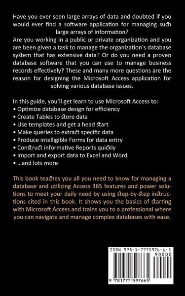 Have you ever seen large arrays of data and doubted if you would ever find a software application for managing such large arrays of information? Are you working in a public or private organization and you are been given a task to manage the organization's database system that has extensive data? Or do you need a proven database software that you can use to manage business records effectively? These and many more questions are the reason for designing the Microsoft Access application for solving various database issues. In this guide, you'll get learn to use Microsoft Access to:Optimize database design for efficiency Create Tables to store data Use templates and get a head start Make queries to extract specific data Produce intelligible Forms for data entry Construct informative Reports quickly Import and export data to Excel and Word ...and lots more This book teaches you all you need to know for managing a database and utilizing Access 365 features and power solutions to meet your daily need by using step-by-step instructions cited in this book. It shows you the basics of starting with Microsoft Access and trains you to a professional where you can navigate and manage complex databases with ease.