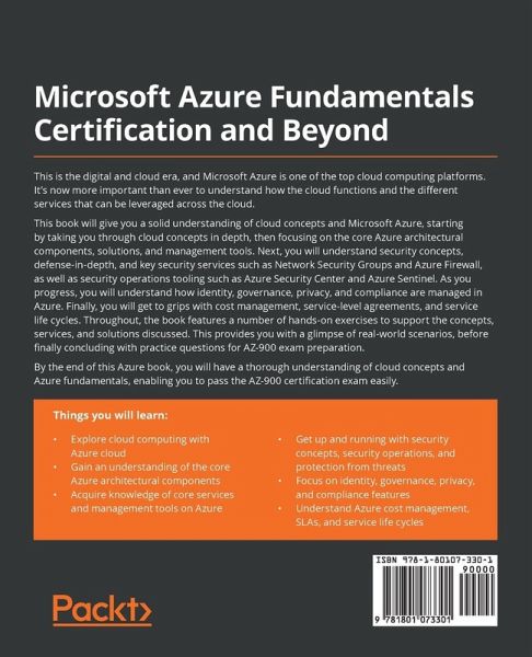 Gain in-depth knowledge of Azure fundamentals that will make it easy for you to achieve AZ-900 certificationKey FeaturesGet fundamental knowledge of cloud concepts and the Microsoft Azure platform Explore practical exercises to gain experience of working with the Microsoft Azure platform in the real world Prepare to achieve AZ-900 certification on the first go with the help of simplified examples covered in the book Book Description This is the digital and cloud era, and Microsoft Azure is one of the top cloud computing platforms. It's now more important than ever to understand how the cloud functions and the different services that can be leveraged across the cloud. This book will give you a solid understanding of cloud concepts and Microsoft Azure, starting by taking you through cloud concepts in depth, then focusing on the core Azure architectural components, solutions, and management tools. Next, you will understand security concepts, defense-in-depth, and key security services such as Network Security Groups and Azure Firewall, as well as security operations tooling such as Azure Security Center and Azure Sentinel. As you progress, you will understand how identity, governance, privacy, and compliance are managed in Azure. Finally, you will get to grips with cost management, service-level agreements, and service life cycles. Throughout, the book features a number of hands-on exercises to support the concepts, services, and solutions discussed. This provides you with a glimpse of real-world scenarios, before finally concluding with practice questions for AZ-900 exam preparation. By the end of this Azure book, you will have a thorough understanding of cloud concepts and Azure fundamentals, enabling you to pass the AZ-900 certification exam easily.What you will learnExplore cloud computing with Azure cloud Gain an understanding of the core Azure architectural components Acquire knowledge of core services and management tools on Azure Get up and running with security concepts, security operations, and protection from threats Focus on identity, governance, privacy, and compliance features Understand Azure cost management, SLAs, and service life cycles Who this book is for This Azure fundamentals book is both for those with technical backgrounds and non-technical backgrounds who want to learn and explore the field of cloud computing, especially with Azure. This book will also help anyone who wants to develop a good foundation for achieving advanced Azure certifications. There is no prerequisite for this book except a willingness to learn and explore cloud concepts and Microsoft Azure.Table of ContentsIntroduction to Cloud Computing Benefits of Cloud Computing Core Azure Architectural Components Core Azure Resources Core Azure Solutions Azure Management Tools Azure Security Azure Identity Services Azure Governance Azure Privacy and Compliance Azure Cost Planning and Management Azure Service-Level Agreements Exam Preparation Practice Tests
