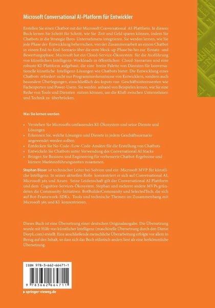 Verstehen Sie Microsofts umfassendes KI-Ökosystem und seine Dienste und LösungenErkennen Sie, welche Lösungen und Dienste in jedem Geschäftsszenario angewendet werden solltenEntdecken Sie No-Code-/Low-Code-Ansätze für die Erstellung von ChatbotsEntwickeln Sie Chatbots unter Verwendung des Conversational AI StacksRichten Sie Geschäft und Entwicklung für verbesserte Chatbot-Ergebnisse und kürzere Markteinführungszeiten ausDieses Buch richtet sich an Entwickler und Power-User, die Chatbots erstellen möchten. Ein Verständnis für die Grundprinzipien des Programmierens moderner Webanwendungen (.NET oder JavaScript) wird vorausgesetzt.