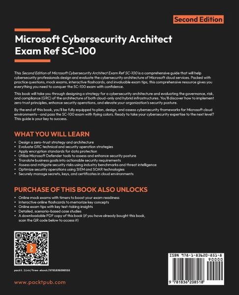 Unlock your potential to pass the SC-100 exam by mastering advanced cloud security strategies, designing zero-trust architectures, and evaluating cybersecurity frameworks with this latest exam guide Purchase of this book unlocks access to web-based exam prep resources such as mock exams, flashcards, exam tips, the eBook PDF Key Features: - Gain a deep understanding of all topics covered in the latest SC-100 exam - Advance your knowledge of architecting and evaluating cybersecurity services to tackle day-to-day challenges - Get certified with ease through mock tests with exam-level difficulty - Benefit from practical examples that will help you put your new knowledge to work Book Description: This Second Edition of Microsoft Cybersecurity Architect Exam Ref SC-100 is a comprehensive guide that will help cybersecurity professionals design and evaluate the cybersecurity architecture of Microsoft cloud services. Packed with practice questions, mock exams, interactive flashcards, and invaluable exam tips, this comprehensive resource gives you everything you need to conquer the SC-100 exam with confidence. This book will take you through designing a strategy for a cybersecurity architecture and evaluating the governance, risk, and compliance (GRC) of the architecture of both cloud-only and hybrid infrastructures. You'll discover how to implement zero trust principles, enhance security operations, and elevate your organization's security posture. By the end of this book, you'll be fully equipped to plan, design, and assess cybersecurity frameworks for Microsoft cloud environments-and pass the SC-100 exam with flying colors. Ready to take your cybersecurity expertise to the next level? This guide is your key to success. What You Will Learn: - Design a zero-trust strategy and architecture - Evaluate GRC technical and security operation strategies - Apply encryption standards for data protection - Utilize Microsoft Defender tools to assess and enhance security posture - Translate business goals into actionable security requirements - Assess and mitigate security risks using industry benchmarks and threat intelligence - Optimize security operations using SIEM and SOAR technologies - Securely manage secrets, keys, and certificates in cloud environments Who this book is for: This book targets is for IT professionals pursuing the Microsoft Cybersecurity Architect Expert SC-100 certification. Familiarity with the principles of administering core features and services within Microsoft Azure, Microsoft 365 and on-premises related technologies (server, active directory, networks) are needed. Prior knowledge of integration of these technologies with each other will also be beneficial. Table of Contents - Cybersecurity in the Cloud - Build an Overall Security Strategy and Architecture - Design a Security Operations Strategy - Design an Identity Security Strategy - Design a Regulatory Compliance Strategy - Evaluate Security Posture and Recommend Technical Strategies to Manage Risk - Design a Strategy for Securing Server and Client Endpoints - Design a Strategy for Securing SaaS, PaaS, and IaaS - Specify Security Requirements for Applications - Design a Strategy for Securing Data
