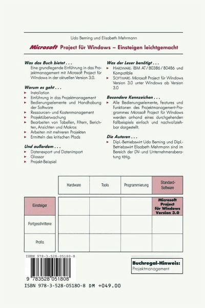 11 Ermitteln des kritischen Pfads . . . . . . . . . . . . . . . . . . . . . . . . . . . . . . . . . . . . . . . . . . . . . . . . . . . . . . . . . . . . . . 121 12 Importieren und Exportieren von Daten . . . . . . . . . . . . . . . . . . . . . . . . . . . . . . . . . . . . . . . . . . . . . . 125 12. 1 Importieren von Daten . . . . . . . . . . . . . . . . . . . . . . . . . . . . . . . . . . . . . . . . . . . . . . . . . . . . . . . . . . . . . . . . . . . . 126 12. 2 Exportieren von Daten . . . . . . . . . . . . . . . . . . . . . . . . . . . . . . . . . . . . . . . . . . . . . . . . . . . . . . . . . . . . . . . . . . . . 127 13 Das Hilfesystem von MS-ProjecL . . . . . . . . . . . . . . . . . . . . . . . . . . . . . . . . . . . . . . . . . . . . . . . . . . . . . . . . 129 13. 1 Der Hilfe-Index . . . . . . . . . . . . . . . . . . . . . . . . . . . . . . . . . . . . . . . . . . . . . . . . . . . . . . . . . . . . . . . . . . . . . . . . . . . . . . 129 13. 2 Lemprogranun . . . . . . . . . . . . . . . . . . . . . . . . . . . . . . . . . . . . . . . . . . . . . . . . . . . . . . . . . . . . . . . . . . . . . . . . . . . . . . . . 130 13. 3 Assistent . . . . . . . . . . . . . . . . . . . . . . . . . . . . . . . . . . . . . . . . . . . . . . . . . . . . . . . . . . . . . . . . . . . . . . . . . . . . . . . . . . . . . . . . . 131 13. 4 Info . . . . . . . . . . . . . . . . . . . . . . . . . . . . . . . . . . . . . . . . . . . . . . . . . . . . . . . . . . . . . . . . . . . . . . . . . . . . . . . . . . . . . . . . . . 132 Glossar . . . . . . . . . . . . . . . . . . . . . . . . . . . . . . . . . . . . . . . . . . . . . . . . . . . . . . . . . . . . . . . . . . . . . . . . . . . . . . . . . . . . . . . . . . . . . . . . . . . . . . . . 133 Projektbeispiel "Batta Batterie AG" . . . . . . . . . . . . . . . . . . . . . . . . . . . . . . . . . . . . . . . . . . . . . . . . . . . . . . . . . . . . 153 Index . . . . . . . . . . . . . . . . . . . . . . . . . . . . . . . . . . . . . . . . . . . . . . . . . . . . . . . . . . . . . . . . . . . . . . . . . . . . . . . . . . . . . . . . . . . . . . . . . . . . . . . . . . . 165 VIII Project für Windows 3. 0 -Einsteigen leicht gemacht Vorwort Die Planung, Steuenmg und Übetwachung von Projekten ist eine Aufgabe, die bisher nur ungenügend durch EDV-Werkzeuge oder Vorgehensmodelle unterstützt wurde. Microsoft hat mit seinem Tool Microsoft Project einen Weg beschritten, der zeigt, wie fortschrittlich, übersichtlich und einfach das Projektmanagement maschinell zu unterstützen ist. Mit diesem Programm fallt es leicht, Projektpläne zu erstellen, zu aktualisieren, zu planen und zu dokmnentieren. Microsoft Project fiir Windows 1M hilft Thnen dabe~ Projekte ~ realistisch nachzubilden, ~ zu aktualisieren und zu überwachen, ~ Problemanalysen und -prognosen vorzunehmen sowie ~ Berichte über den Projektzustand zu erstellen. Microsoft Project fiir Windows 1M zeichnet sich durch eine interaktive, gra phisch orientierte Benutzeroberfläche aus, die durch eine Vielzahl von Dar stellungsmöglichkeiten das Projektmanagement wesentlich vereinfacht. Microsoft hat mit Microsoft Project fiir Windows 1M Version 3. 0 ein Pro jektplanungsprogramm vorgestellt, daß fiir die Benutzeroberfläche Win dows entwickelt wurde. Die neue Version 3. 0 nutzt bereits die erweiterten Möglichkeiten der neuen Windows Version 3. 1 aus.