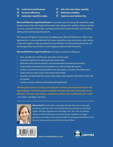 Microsoft Word for Legal Practitioners is a practical, step-by-step guide created by a legal professional to help other legal professionals turbo-charge their work flow, improve content accuracy, automate routine tasks, and improve the level of professionalism when drafting, editing and reviewing legal documents. This 272-page, full-colour manual will help you harness the incredible power Microsoft Word has to offer in your legal practice. It comes packed with screenshots, easy instructions, and a variety of tips and insights to help you make the most of Word in the fast-paced, pressurised, and technology driven legal environment in which you likely find yourself. Examples are specifically chosen to reflect the day-to-day word processing tasks performed in a legal practice. You will gain an overview of functions used by legal practitioners and where to find them in Word; learn how to make drafting legal documents much easier and quicker; learn how to work effectively with formatting; learn how to automate many of the routine tasks you perform daily; learn how to review documents, track changes, and compare versions of a document; learn different methods of protecting your documents; learn how to create document templates so that you can standardise the formatting of documents throughout your practice; learn different methods of viewing documents; learn how to professionally draft your documents, manage multi-level numbered clauses, create an automatic table of contents, and seamlessly create accurate cross-references within your document; learn how to create macros to automate word processing tasks; learn how to create and auto-populate fields in your document with important details; learn a whole bunch of handy functions and time-saving tips and tricks that will dramatically speed up your workflow and legal document processing; and much more. In a nutshell, Microsoft Word for Legal Practitioners will help you and your colleagues:Save valuable time and free you up to take on more work. Automate repetitive formatting and document tasks. Eliminate many of the frustrations encountered when formatting documents. Create handy and professional templates for on-the-go legal documents. Produce consistently neat and professional documents, no matter who drafts them. Improve the accuracy of your documents and content. Populate standard legal documents with unique, client-specific information at the click of a button. Convey a strong, cohesive and professional legal brand.