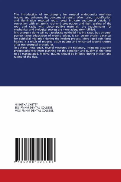 The introduction of microsurgery for surgical endodontics minimizes trauma and enhances the outcome of results. When using magnification and illumination resected roots reveal intricate anatomical details. In conjuction with ultrasonic root-end preparation and tight sealing of the root end cavity with biocompatible materials, the requirements for mechanical and biological success are more adequately fulfilled. Microsurgery alone will not accelerate epithelial healing rates, but through perfect tissue adaptation of wound edges, it can create smaller distances for epithelial migration during the healing process. More rapid soft tissue healing is a result of reduced tissue trauma and enhanced wound closure after microsurgical procedures. To achieve these goals, several measures are necessary, including accurate preoperative treatment planning for the condition and quality of the tissue to be manipulated. Minimal trauma should be inflicted during incision and raising of the flap.