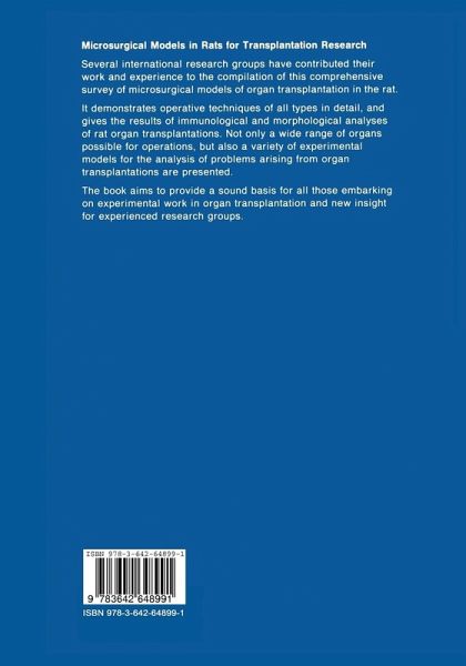 A. Microsurgical Models and Techniques.- History and Development of Experimental Microsurgery in Rats.- Reflections on the Requirements and Perspectives of a Microsurgical Research Group.- Techniques of Microsurgical Vascular Anastomoses in Experimental Microsurgery.- Heart Transplantation in Rats.- Accessory Heart Transplantation in the Neck: A Simple Model in the Rat Using the Cuff Technique for Vascular Anastomoses.- Microvascular Pulmonary Transplantation in Rats.- Spleen and Vascularized Skin Flap Transplantation.- Renal Transplantation in the Rat.- Microsurgical Technique for Small-Intestine Transplantation.- Various Techniques of Experimental Pancreas Transplantation in the Rat.- Experiences in Rat Pancreatic Islet-Cell Isolation and Transplantation.- Technique for Orthotopic Rat Liver Transplantation.- B. Immunological Principles.- Theoretical Aspects of Rat Organ Transplantation.- Immunogenetic Aspects of Organ Transplantation in the Rat.- C. Results of Vessel and Heart Transplantation.- Venovenous Allotransplantation in the Rat.- The Rejection Response to Segmental Grafts of the Femoral Artery in Inbred Rat Strains.- Factors Influencing Endothelial-Cell Viability During Procurement and Preservation of Valve Allografts.- The Rat Model as Precursor of Clinical Lymph Vessel Transplantation.- Microstructure of Allogeneic Lymph Vessel Transplants in the Rat.- Immunogenetic Basis of Heart Transplantation.- Cyclosporin A in Heart Allografts in Rats.- D. Results of Small-Instestine Transplantation, Graft Versus Host Reaction, and Host Versus Graft Reaction.- Monitoring of Rejection and Absorption Studies After Small-Bowel Transplantation in the Dog Model.- Migration of Donor Passenger Cells During Rat Cardiac and Intestinal Allograft Rejection.- Rejection and Graft Versus Host Reaction Following Small-Bowel Transplantation and Methods of Circumventing Them.- Immunological Reactions Induced by Graft Versus Host Reaction Following Small-Bowel Transplantation.- E. Pancreas Transplantation Versus Islet Transplantation.- Combined Pancreas and Kidney Transplantation in the Rat.- Immunological Characteristics of Vascularized Pancreas Transplantation.- Is Preserved Exocrine Secretion Mandatory for Optical Endocrine Function in Vascularized Pancreas Transplantation?.- The Effect of Temporary Cyclosporin A Treatment on the Endocrine Function of Pancreaticoduodenal Allografts in the Rat.- The Influence of Exocrine Secretion Management on Graft Survival in Different Pancreatic Transplant Models.- Investigations of Glucose Tolerance Following Pancreatic Transplantation in Rats with Streptozotocin-Induced Diabetes.- Successful Allotransplantation of Islets as Composite Graft in a Strong Rejection Model.- The Immunogenicity of Pancreatic Islets.- A New Approach to Experimental Pancreatic Islet Transplantation: Ultraviolet Irradiation.- Characterization of Pancreas Islet-Cell Ractivity with Various Immune Sera.- F. Results of Liver Transplantation.- Heterotopic Auxiliary Liver Transplantation with Respect to Its Clinical Application.- Accelerated But Not Hyperacute Rejection of Liver Allografts in Hypersensitized Rats.- Orthotopic Versus Auxiliary Liver Transplantation.- Fine-Needle Aspiration Cytology of Orthotopic Liver Allografts in Rats.- Immunosuppressive Effects of Liver Grafts in the Rat.- Graft Tolerance After Orthotopic Liver Transplantation in a Primarily Nontolerant Strain Combination Following Temporary Cyclosporin A Treatment.- Liver Transplantation and Cyclosporin A Therapy: Induction of Tolerance in a Strong Rejection Combination.- Study of the Cellular Immunity of Tolerance Induced by Liver Grafting in the Rat.- Mechanisms of Tolerance in Rat Liver Transplantation.- G. Miscellaneous: Microsurgical Organ Transplantation.- Decreased Graft Versus Host Reaction After Portal Venous Drainage of Spleen Grafts in Inbred Strains of Rats.- Do Transplants with Venous Drainage into the Portal System Undergo Delayed Rejection?.- Tran