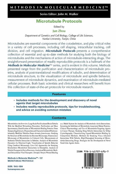 Microtubules are essential components of the cytoskeleton, and play critical roles in a variety of cell processes, including cell shaping, intracellular tracking, cell division, and cell migration. Microtubule Protocols presents a comprehensive collection of essential and up-to-date methods for studying both the biology of microtubules and the mechanisms of action of microtubule-interacting drugs. The straightforward presentation of readily reproducible protocols is a hallmark of the Methods in Molecular Medicine(TM) series, and is evident in this volume. Methods presented range from the purification and characterization of microtubule proteins, analysis of post-translational modifications of tubulin, and determination of microtubule structure, to the visualization of microtubule and spindle behavior, measurement of microtubule dynamics, and examination of microtubule-mediated cellular processes. Both basic scientists and clinical researchers will benefit from this collectionof state-of-the-art protocols for microtubule research.