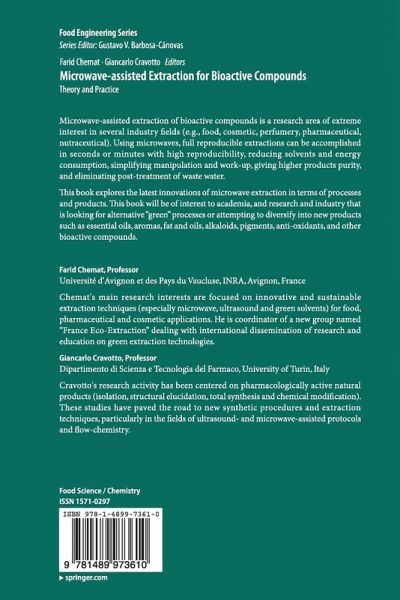 With increasing energy prices and the drive to reduce CO2 emissions, food industries are challenged to find new technologies in order to reduce energy consumption, to meet legal requirements on emissions, product/process safety and control, and for cost reduction and increased quality as well as functionality. Extraction is one of the promising innovation themes that could contribute to sustainable growth in the chemical and food industries. For example, existing extraction technologies have considerable technological and scientific bottlenecks to overcome, such as often requiring up to 50% of investments in a new plant and more than 70% of total process energy used in food, fine chemicals and pharmaceutical industries. These shortcomings have led to the consideration of the use of new "green" techniques in extraction, which typically use less solvent and energy, such as microwave extraction. Extraction under extreme or non-classical conditions is currently a dynamically developing area in applied research and industry. Using microwaves, extraction and distillation can now be completed in minutes instead of hours with high reproducibility, reducing the consumption of solvent, simplifying manipulation and work-up, giving higher purity of the final product, eliminating post-treatment of waste water and consuming only a fraction of the energy normally needed for a conventional extraction method. Several classes of compounds such as essential oils, aromas, anti-oxidants, pigments, colours, fats and oils, carbohydrates, and other bioactive compounds have been extracted efficiently from a variety of matrices (mainly animal tissues, food, and plant materials). The advantages of using microwave energy, which is a non-contact heat source, includes more effective heating, faster energy transfer, reduced thermal gradients, selective heating, reduced equipment size, faster response to process heating control, faster start-up, increased production, and elimination of process steps. This book will present a complete picture of the current knowledge on microwave-assisted extraction (MAE) of bioactive compounds from food and natural products. It will provide the necessary theoretical background and details about extraction by microwaves, including information on the technique, the mechanism, protocols, industrial applications, safety precautions, and environmental impacts.
