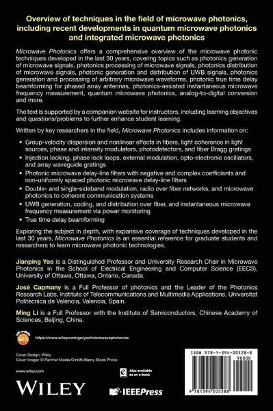 Overview of techniques in the field of microwave photonics, including recent developments in quantum microwave photonics and integrated microwave photonics Microwave Photonics offers a comprehensive overview of the microwave photonic techniques developed in the last 30 years, covering topics such as photonics generation of microwave signals, photonics processing of microwave signals, photonics distribution of microwave signals, photonic generation and distribution of UWB signals, photonics generation and processing of arbitrary microwave waveforms, photonic true time delay beamforming for phased array antennas, photonics-assisted instantaneous microwave frequency measurement, quantum microwave photonics, analog-to-digital conversion and more. The text is supported by a companion website for instructors, including learning objectives and questions/problems to further enhance student learning. Written by key researchers in the field, Microwave Photonics includes information on: * Group-velocity dispersion and nonlinear effects in fibers, light coherence in light sources, phase and intensity modulators, photodetectors, and fiber Bragg gratings * Injection locking, phase lock loops, external modulation, opto-electronic oscillators, and array waveguide gratings * Photonic microwave delay-line filters with negative and complex coefficients and non-uniformly spaced photonic microwave delay-line filters * Double- and single-sideband modulation, radio over fiber networks, and microwave photonics to coherent communication systems * UWB generation, coding, and distribution over fiber, and instantaneous microwave frequency measurement via power monitoring * True time delay beamforming Exploring the subject in depth, with expansive coverage of techniques developed in the last 30 years, Microwave Photonics is an essential reference for graduate students and researchers to learn microwave photonic technologies.