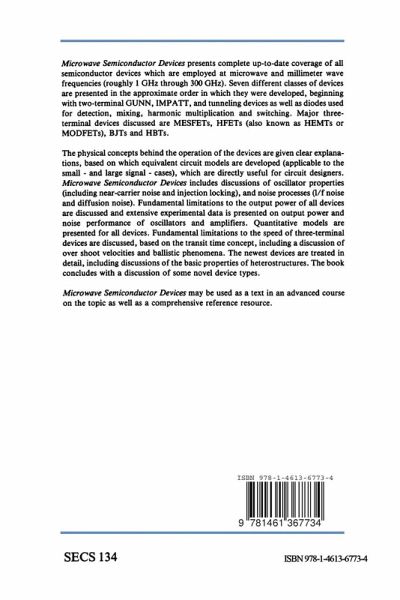 1 Review of semiconductor physics and devices.- Energy bands.- Statistical properties of electrons and holes.- Carrier transport.- Carrier recombination and generation.- P-N-junctions.- Schottky barriers.- Reverse break-down.- Phonons.- References.- Further reading.- 2 Transferred electron devices (TED) - GUNN devices.- Electron transfer and negative differential mobility.- High-field dipole domains in GUNN devices.- Modes of operation of GUNN devices.- Indium phosphide transferred electron devices/ millimeter wave operation of TED's.- Example: Growth rate of a high-field dipole Domain - the "equal areas" rule.- Stationary domain at the anode.- Problems, Chapter 2.- References.- Further reading.- 3 IMPATT (Impact Avalanche Transit Time) devices.- Operation of IMPATT devices-physical discussion.- Small-signal theory of IMPATT device impedance.- Estimate of the power conversion efficiency of IMPATT devices - a simple large signal model.- Doping profiles for IMPATT diodes.- An analytical large-signal model of IMPATT devices.- Non-steady state large signal models for IMPATT devices.- Problems, Chapter 3.- References.- Additional reading.- 4 Tunneling devices.- Tunnel diodes.- Resonant tunneling devices.- Problems, Chapter 4..- References.- Further reading.- 5 Fundamental limitations on power output from solid-state microwave devices.- The thermal limit.- The electronic limit.- Measured data for rf power.- Problems, Chapter 5.- References.- 6 Basic properties and circuit aspects of oscillators and amplifiers based on two-terminal devices.- A basic oscillator model.- Injection locking of oscillators.- Model for FM- and AM-noise in oscillators.- Actual noise observed in two-terminal solid state devices.- Electronic tuning of solid state oscillators.- Examplesof actual circuits and impedance diagrams for GUNN and IMPATT oscillators.- Negative resistance devices used as amplifiers.- Problems, Chapter 6.- References.- Further reading.- 7 Power-combining.- Chip-level power-combining.- Circuit level power combining.- Spatial (quasi-optical) power-combining.- Problems, Chapter 7.- References.- Further reading.- 8 Review of noise processes and noise concepts relevant to microwave semiconductor devices.- Thermal noise - noise figure and equivalent noise temperature.- Shot noise.- Diffusion noise.- Flicker noise, or 1/F-noise.- References.- Further reading.- 9 Diode applications to microwave frequency conversion and control.- Frequency-conversion devices.- Semi-conductor diode detectors.- Schottky barrier diodes.- Semi-conductor diode mixers: intrinsic conversion loss.- Parasitic element effects in semiconductor mixers.- Noise figure/noise temperature of mixer receivers.- Other types of mixers.- Noise temperature versus frequency for mixers.- Varactor harmonic multipliers.- PIN diodes and microwave control devices.- Problems, Chapter 9.- References.- Further reading.- 10 MESFET Devices.- I-V-characteristics of MESFETs.- Small-signal equivalent circuit model.- Ultra-fast electrons, or how ballistic can an electron be.- The Fukui noise model for MESFETs.- The Pucel-Haus-State noise model.- Noise in FET oscillators.- Power-frequency limitations in MESFETs.- Overview.- Problems, Chapter 10.- References.- Further reading.- 11 HFETs - Heterojunction Field Effect Transistors.- Discussion of the I-V-characteristics of a HFET.- Transconductance and cut-off frequencies for HFETs.- Indium-based heterostructures for HFETs.- Microwave equivalent circuit for HFETs.- Noise modeling of HFETs - comparison with MESFETs.- Review of noise datafor HFETs and MESFETs.- HFET power amplifiers.- HFET oscillators.- Overview.- Problems, Chapter 11.- References.- Further reading.- 12 Bipolar microwave transistors.- Basic relations for microwave BJTs.- Equivalent circuit of the BJT - frequency-performance.- Noise modeling of BJTs.- BJT power amplifiers and oscillators.- Heterojunction bipolar transistors (HBTs).- Structure and I-V-characteristics of HBTs.- Equivalent circuit and cut-off-frequencies of HBTs.- HBTs with other material combinations than A1GaAs/GaAs.- Noise properties of HBTs.- HBT power amplifiers and oscillators.- Overview.- Problems, Chapter 12.- References.- Further reading.- 13 Overview of conventional and novel devices.- Hot electron transistors.- Resonant tunneling transistors.- Permeable base transistors.- Review of the performance of microwave semiconductor devices - 1990.- Conclusion.- References.- Further reading.
