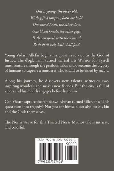 One is young, the other old. With gifted tongues, both are bold. One blood heals, the other slays. One blood kneels, the other pays. Both can speak with their mind. Both shall seek, both shall find. In this twisted magic and mayhem tale, young Vidarr Allefar begins his quest in service to the God of Justice. The d'oglemann turned martial arts Warrior for Tyrrell must venture through the perilous wilds and overcome the bigotry of humans to capture a murderer who is said to be aided by magic. Along his journey, he discovers new talents, witnesses awe-inspiring wonders, and makes new friends. But the city is full of vipers and his mouth engages before his brain. Can Vidarr capture the famed swordsman turned killer, or will his quest turn into tragedy? Not just for himself, but also for his kin and the Gods themselves.