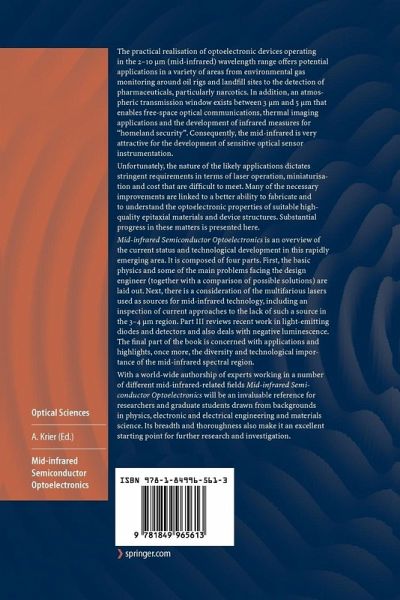 Mid-infrared Semiconductor Optoelectronics is an overview of the current status and technological development in this rapidly emerging area; the basic physics, some of the problems facing the design engineer and a comparison of possible solutions are laid out; the different lasers used as sources for mid-infrared technology are considered; recent work in detectors is reviewed; the last part of the book is concerned with applications.
