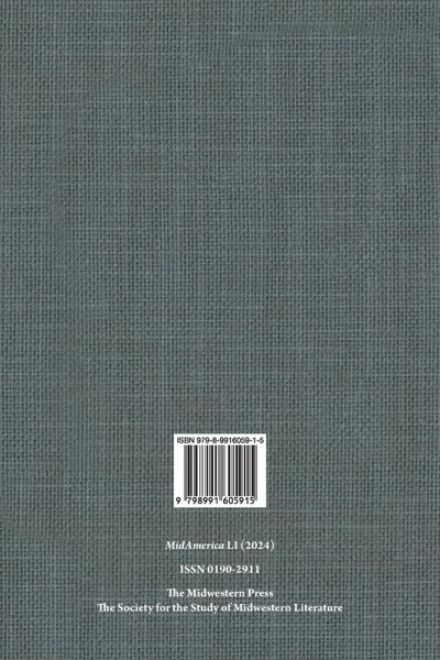 MidAmerica is a peer-reviewed academic journal published annually by The Society for the Study of Midwestern Literature. Contents of issue LI (2024):"Can Technical College Students 'Think Like a Mountain'?" -- Gretchen Lida "Anderson, Trilling, and the Influence of Powerful Critics: Score One for the Author" -- Robert Dunne "'An Antydote fer the Brute': Apocalyptic Imagination in Farmer Hiram on the World's War" -- Jefferson Storms "Multiple Awakenings in Sherwood Anderson's Story 'An Awakening'" -- Janet Ruth Heller "Beatrice Roethke's Marginalia: Unseen Narratives about a Pulitzer Poet's Legacy" -- Madeline Bruessow and Sherrin Frances "Marcie R. Rendon's Cash Blackbear Crime-Fiction Series and Nordic Settler Colonial Legacies in Minnesota's Red River Valley" -- Rosemary Erickson Johnsen "Green People in Dingess, Roberts, and Gieni's Manifest Destiny: Flora and Fauna" -- Alexandria Remm "Two New Books on Hemingway: A Review Essay" -- Michael Schupska "Floods, Fonts, and Waterways in Midwestern Poetry: A Review Essay" -- Eleanor Reeds "Midwestern Angles: A Review Essay" -- Eric Tucker "Restoring the Upper Midwest from Landscape to Literature: A Review Essay" -- Christian Knoeller "Annual Bibliography of Midwestern Literature, 2022" -- Robert Beasecker
