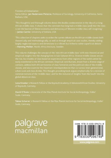 1. Introduction: Africa's Middle Classes in Critical Perspective; Tabea Scharrer, David O'Kane and Lena Kroeker .- Section 1: Rethinking Concepts of Middle Classes in Africa.- 2. Turning the Poor into Something More Inspiring: The Creation of the African Middle Class Controversy; Dominique Darbon .- 3. The Narrative of 'the African Middle Class' and its Conceptual Limitations; Dieter Neubert and Florian Stoll.- 4. Anthropology and Class in Africa: Challenges of the Past and Present.- Section 2: The Recurring Rise and Return of Middle Classes in Africa; David O'Kane and Tabea Scharrer.- 5. The Ghanaian Middle Class, Social Stratification, and Long-Term Dynamics of Upward and Downward Mobility of Lawyers and Teachers; Jan Budniok and Andrea Noll .- 6. The Nubians of Kibera 'Revisited': Detribalized Natives, Slum Dwellers, Middle class?; Johanna Sarre .- 7. Saving and Serving the Nation: HIV Politics and the Emergence of New Professional Classes in Botswana; Astrid Bochow .- Section 3:The Political Consequences of the Middle Classes.-8. Propertied Citizenship in a Township and Suburb in Johannesburg; Barbara Heer .- 9. Thinking Sierra Leone and Building a New Middle Class: Political Expression and Political Values at the University of Makeni; David O'Kane .- 10. African Middle Classes: Formation and Destabilizing Effects.- Section 4: Formation of Social Interconnections and Interdependencies; Jason Musyoka .- 11. Pathways into the Middle: Rites of Passage and Emerging Middle Classes in Namibia; Julia Pauli .- 12. Middle Class Approaches to Social Security in Kenya; Lena Kroeker .- 13. Middle Classes and 'Moderate Prosperity' in Rural Madagascar; Tsiry Andrianampiarivo .- 14. Afterword. The (Idea of) African Middle Classes: Theorizing from Africa; Rachel Spronk.