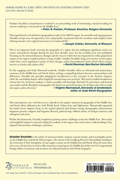 This contemporary text-the first in over a decade on the region-presents the geography of the Middle East and North Africa, defined as the Arab World, Israel, Turkey, Iran, and Afghanistan. Thematically organized, the book's eleven chapters focus on the region's physical and climatic setting, demographic characteristics, migration patterns, religious and linguistic diversity, political map, offshore claims, oil and gas resources, and subregions and states. Within this framework, Drysdale emphasizes pressing current problems: the impact of climate change in a region where some areas already suffer from extreme summer heat and aridity, the challenge of providing additional water in a region where per capita availability of freshwater is already the lowest in the world, the impact of high fertility and rapid population growth in a fragile environment where economies are often unable to absorb young workers entering the labor force, the looming prospect of an aging population, the effects of out- and in-migration, the diverse impact and role of Islam in daily and public life, the integrative consequences of linguistic and ethnic diversity, the evolution and imperfections of the political map, ongoing territorial and boundary disputes that often have global repercussions, external dependence on the region's prolific oil and gas resources, and the extreme regional inequalities associated with their presence or absence. This timely and insightful analysis is essential reading for students of the region who need a better understanding of key regional characteristics, challenges, and issues.
