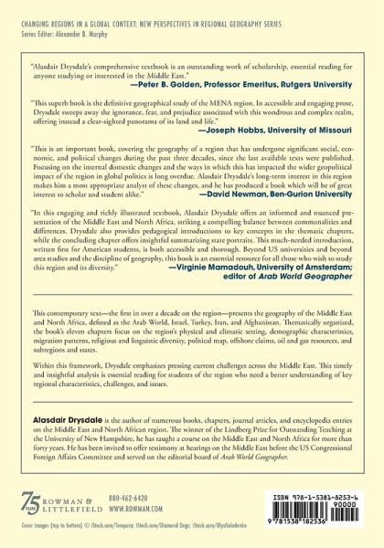 This contemporary text-the first in over a decade on the region-presents the geography of the Middle East and North Africa, defined as the Arab World, Israel, Turkey, Iran, and Afghanistan. Thematically organized, the book's eleven chapters focus on the region's physical and climatic setting, demographic characteristics, migration patterns, religious and linguistic diversity, political map, offshore claims, oil and gas resources, and subregions and states. Within this framework, Drysdale emphasizes pressing current problems: the impact of climate change in a region where some areas already suffer from extreme summer heat and aridity, the challenge of providing additional water in a region where per capita availability of freshwater is already the lowest in the world, the impact of high fertility and rapid population growth in a fragile environment where economies are often unable to absorb young workers entering the labor force, the looming prospect of an aging population, the effects of out- and in-migration, the diverse impact and role of Islam in daily and public life, the integrative consequences of linguistic and ethnic diversity, the evolution and imperfections of the political map, ongoing territorial and boundary disputes that often have global repercussions, external dependence on the region's prolific oil and gas resources, and the extreme regional inequalities associated with their presence or absence. This timely and insightful analysis is essential reading for students of the region who need a better understanding of key regional characteristics, challenges, and issues.