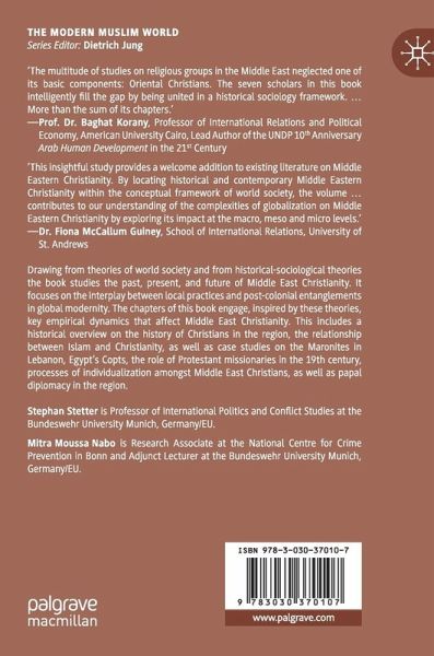 Drawing from theories of world society and from historical-sociological theories the book studies the past, present, and future of Middle East Christianity. It focuses on the interplay between local practices and post-colonial entanglements in global modernity. The chapters of this book engage, inspired by these theories, key empirical dynamics that affect Middle East Christianity. This includes a historical overview on the history of Christians in the region, the relationship between Islam and Christianity, as well as case studies on the Maronites in Lebanon, Egypt's Copts, the role of Protestant missionaries in the 19th century, processes of individualization amongst Middle East Christians, as well as papal diplomacy in the region.