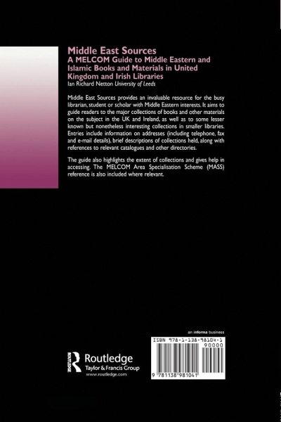 Middle East Sources provides an invaluable resource for the busy librarian, student or scholar with Middle Eastern interests. It aims to guide readers to the major collections of books and other materials on the subject in the UK and Ireland, as well as to some lesser known but nonetheless interesting collections in smaller libraries. Entries are fully up to date and include information on addresses (including telephone, fax and e-mail details), brief descriptions of collections held, along with references to relevant catalogue material and other directories. The guide also highlights the extent of collections and gives help in accessing. The MELCOM Area Specialisation Scheme (MASS) designation of the collections is also included where relevant.