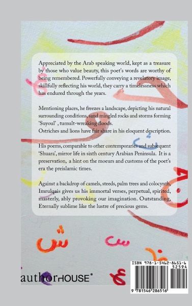 Appreciated by the Arab speaking world, kept as a treasure by those who value beauty, this poet's words are worthy of being remembered. Powerfully conveying a revelatory image, skillfully reflecting his world, they carry a timelessness which has endured through the years. Mentioning places, he freezes a landscape, depicting his natural surrounding conditions, sand mingled rocks and storms forming 'Suyoul' , tumult-wreaking floods. Ostriches and lions have fair share in his eloquent description. His poems, comparable to other contemporaries and subsequent Shuara, mirror life in sixth century Arabian Peninsula. It is a preservation, a hint on the moeurs and customs of the poets era the preislamic times. Against a backdrop of camels, steeds, palm trees and colocynth, Imrulqais gives us his immortal verses, perpetual, spirited, masterly, ably provoking our imagination. Outstanding, Eternally sublime like the lustre of precious gems.