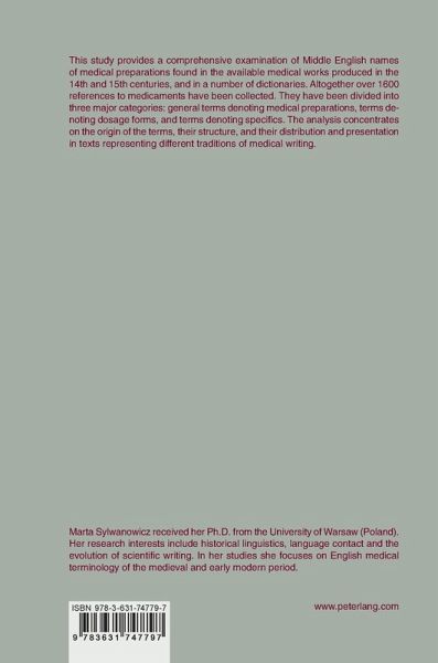 This study provides a comprehensive examination of Middle English names of medical preparations found in the available medical works produced in the 14th and 15th centuries, and in a number of dictionaries. Altogether over 1600 references to medicaments have been collected. They have been divided into three major categories: general terms denoting medical preparations, terms denoting dosage forms, and terms denoting specifics. The analysis concentrates on the origin of the terms, their structure, and their distribution and presentation in texts representing different traditions of medical writing.