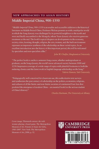 Introduction: Middle Imperial China in East Asian and world History 1. The turbulent tenth century: transforming the East Asian world 2. Song in a multipolar world 3. Schooling, state, and society in song and Jin 4. An economic revolution? 5. Cities and urban life 6. Religious transformations 7. Ways of knowing: learning and knowledge 8. The arts of culture 9. Gendered and generational lives: women, men, children and families 10. Mapping the built and natural environment 11. Sustaining life and healing bodies: food and medicine 12. The Mongol Yuan dynasty in China 13. Yuan China in the Mongol Eurasian Empire.