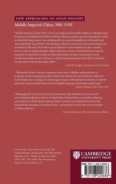 In this highly readable and engaging work, Linda Walton presents a dynamic survey of China's history from the tenth through the mid-fourteenth centuries from the founding of the Song dynasty through the Mongol conquest when Song China became part of the Mongol Empire and Marco Polo made his famous journey to the court of the Great Khan. Adopting a thematic approach, she highlights the political, social, economic, intellectual, and cultural changes and continuities of the period often conceptualized as 'Middle Imperial China'. Particular emphasis is given to themes that inform scholarship on world history: religion, the state, the dynamics of empire, the transmission of knowledge, the formation of political elites, gender, and the family. Consistent coverage of peoples beyond the borders - Khitan, Tangut, Jurchen, and Mongol, among others - provides a broader East Asian context and introduces a more nuanced, integrated representation of China's past.