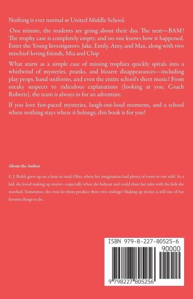Nothing is ever normal at United Middle School. .One minute, the students are going about their day. The next-BAM! The trophy case is completely empty, and no one knows how it happened. Enter the Young Investigators: Jake, Emily, Amy, and Max, along with two mischief-loving friends, Mia and Chip What starts as a simple case of missing trophies quickly spirals into a whirlwind of mysteries, pranks, and bizarre disappearances-including play props, band uniforms, and even the entire school's sheet music! From sneaky suspects to ridiculous explanations (looking at you, Coach Roberts), the team is always in for an adventure. If you love fast-paced mysteries, laugh-out-loud moments, and a school where nothing stays where it belongs, this book is for you!
